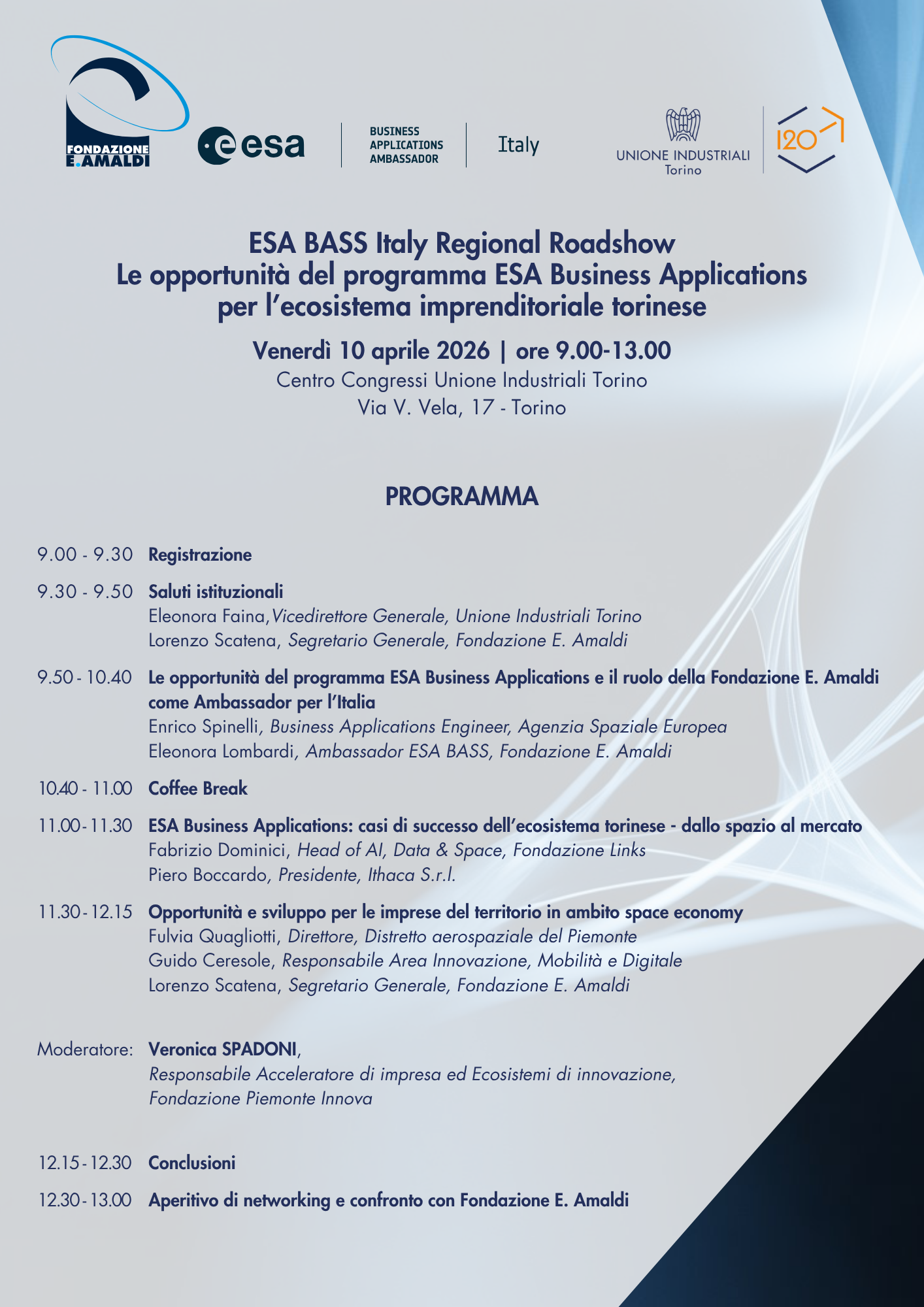Il prossimo 10 aprile, il Centro Congressi dell’Unione Industriali Torino farà da cornice alla prima tappa 2026 dell’ESA BASS Italy Regional Roadshow, l’iniziativa dedicata alla promozione delle opportunità offerte dal programma ESA Business Applications.