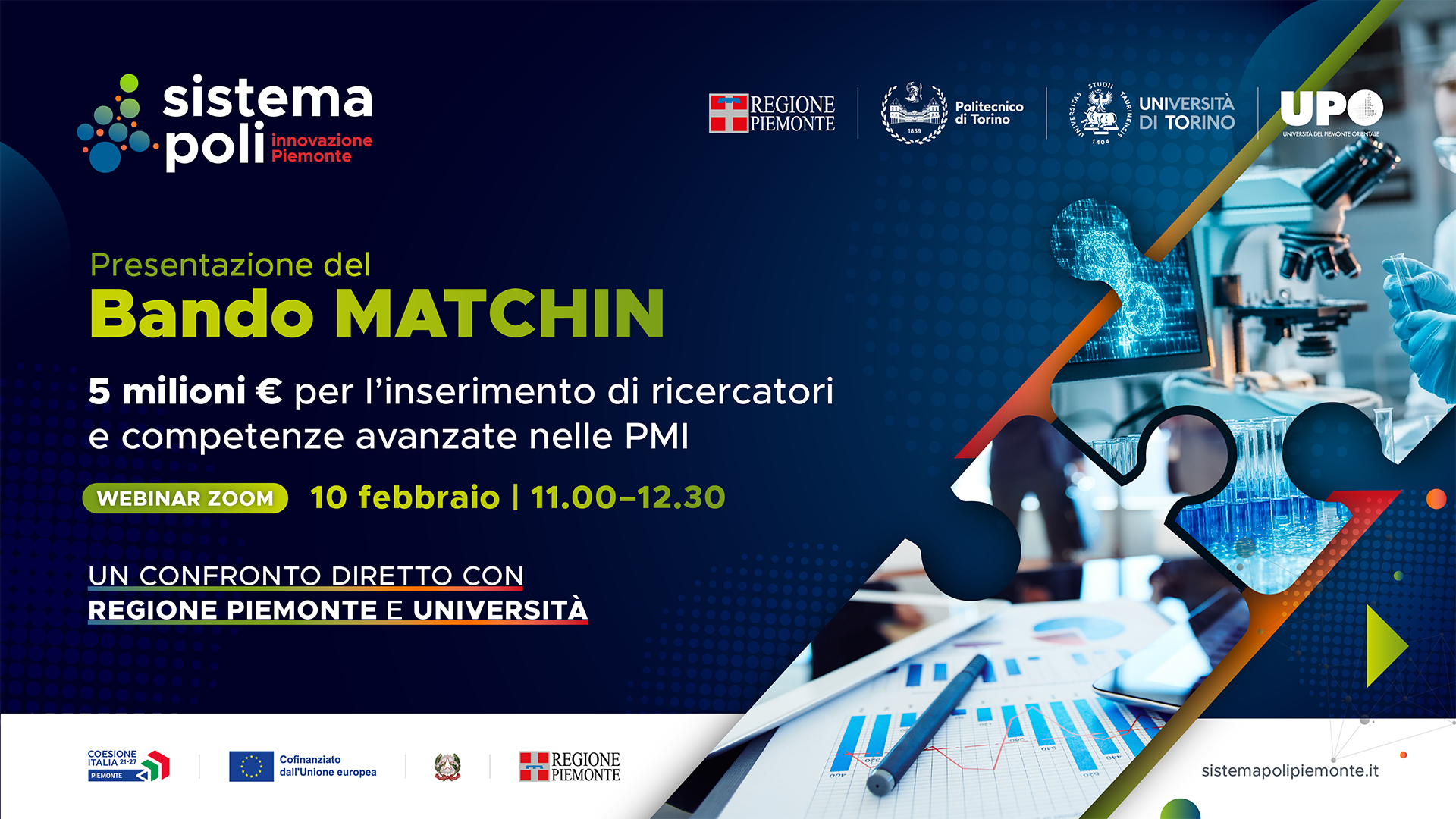 Il Sistema Poli organizza un webinar informativo dedicato al Bando MATCHIN – Mobilizing Advanced Talents for Competence and High Innovation, l’iniziativa della Regione Piemonte pensata per favorire l’innovazione nelle PMI attraverso l’inserimento in azienda di profili ad alta qualificazione provenienti dal mondo della ricerca.